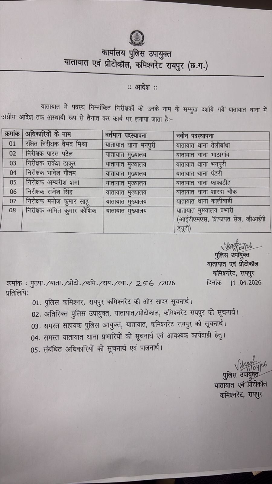 RAIPUR : यातायात एवं प्रोटोकॉल , रायपुर पुलिस द्वारा जारी आवेदन के तहत आठ निरीक्षकों को अस्थाई रूप से विभिन्न थानों में पदस्त थानों में पदस्त किया गया है ।